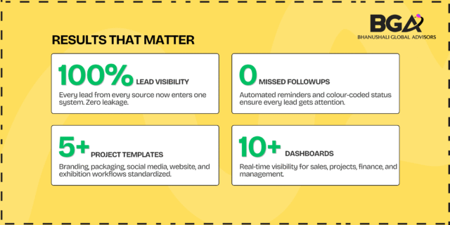 The result: Leads were leaking, follow-ups were missed, project timelines were unclear, revision histories were lost, and management had zero dashboard visibility into what was happening across sales or delivery.